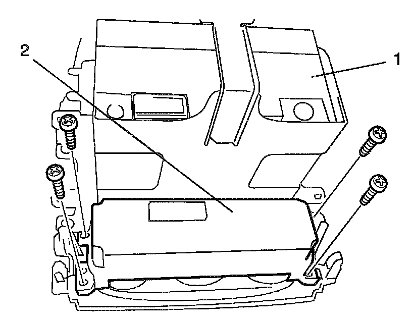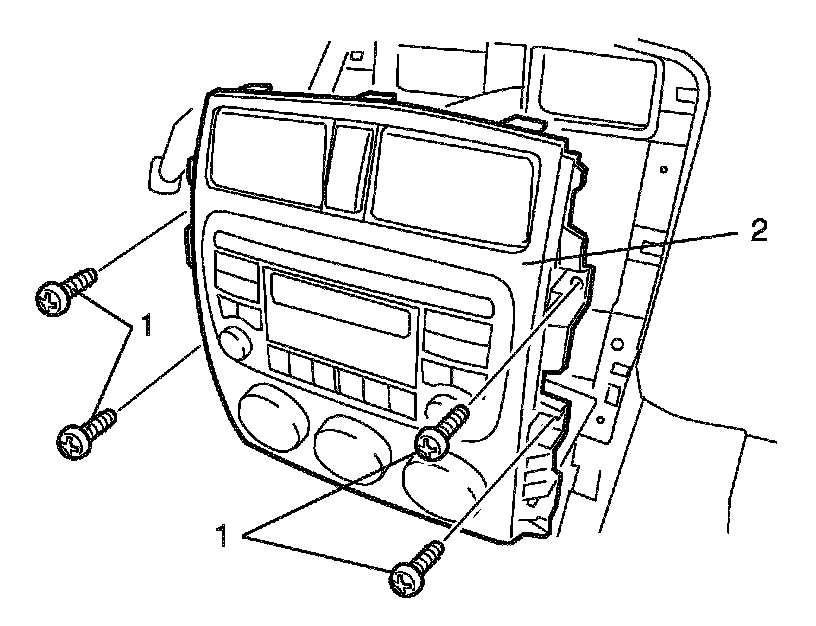 8. Remove screws and HVAC control module (2) from instrument panel center garnish.