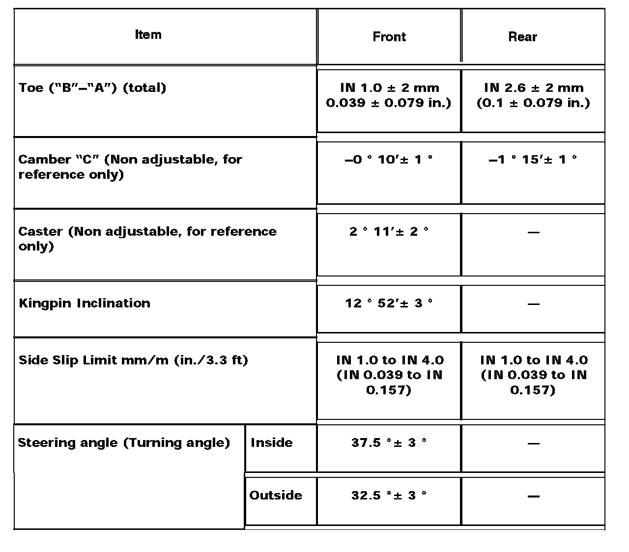 Toe value in the specifications table was measured using a toe-in gauge.