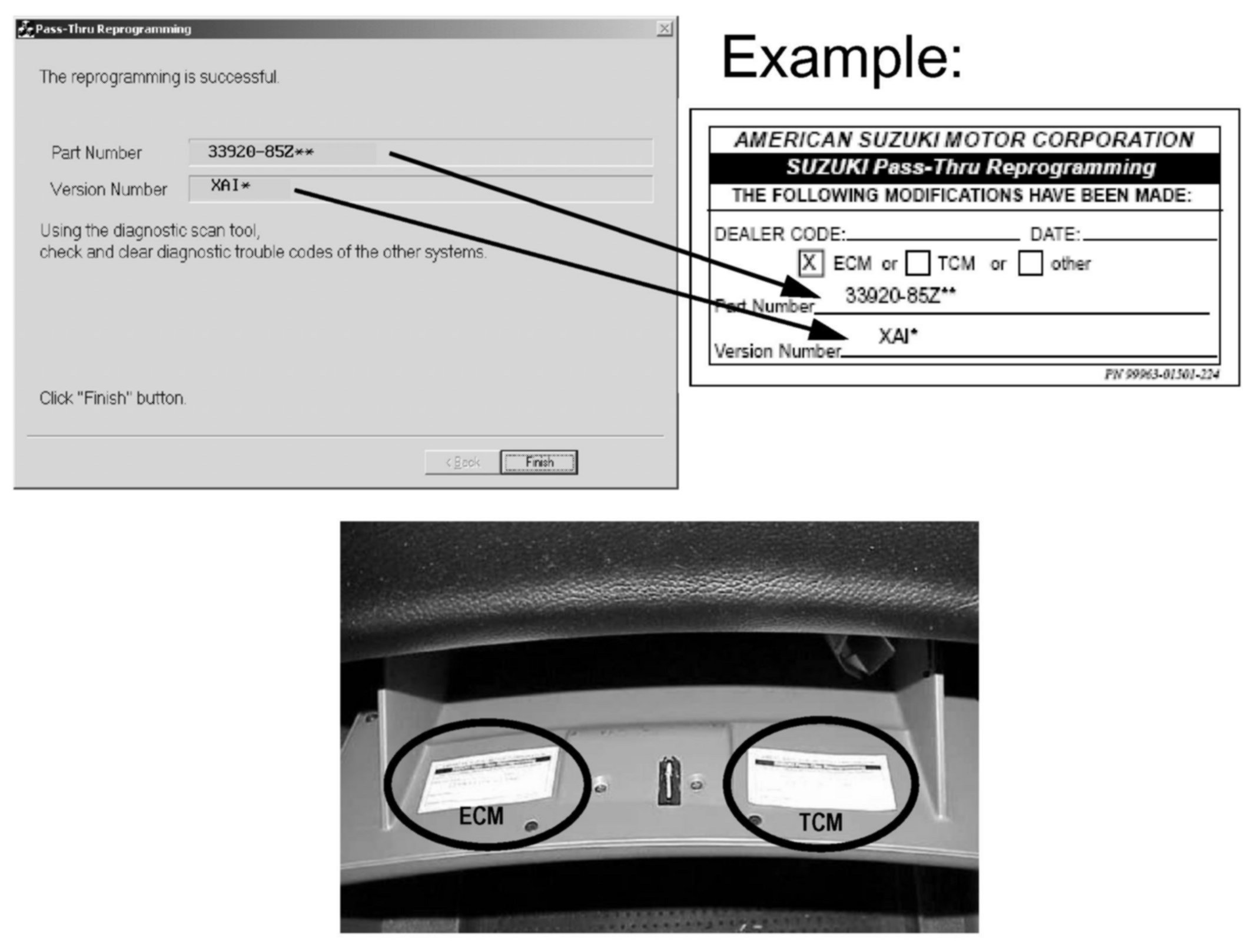 4. Fill out the Reprogram Label P/N 99963-01501-224 (the part number and version will be displayed at the "The reprogramming is successful screen). Then affix the label to the back of the glove box door as pictured.