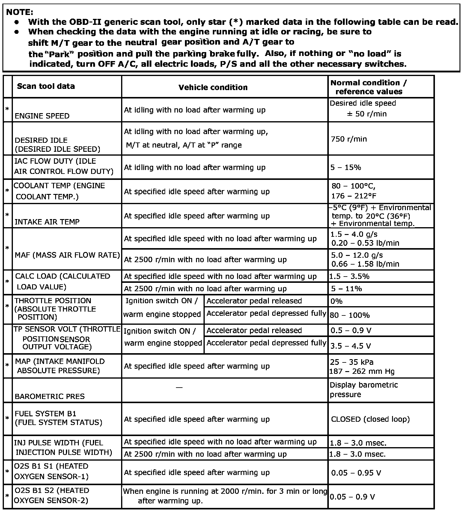 Scan Tool DataAs the data values are standard values estimated on the basis of values obtained from the normally operating vehicles by using a scan tool, use them as reference values. Even when the vehicle is in good condition, there may be cases where the checked value does not fall within each specified data range. Therefore, judgment as abnormal should not be made by checking with these data alone.