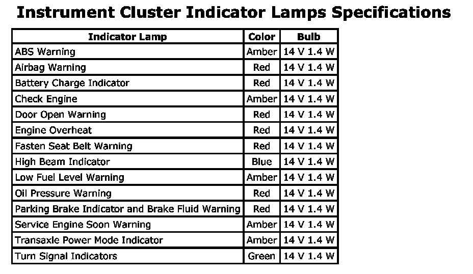 Instrument Cluster Indicator Lamps Specifications: