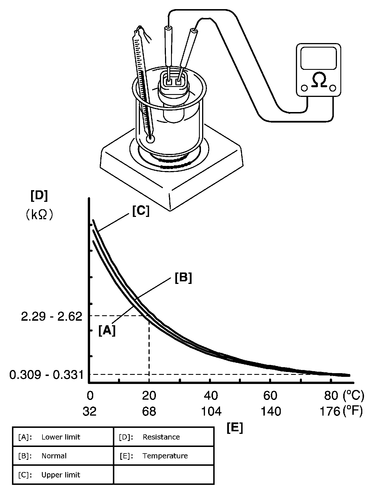 Immerse temperature sensing part of ECT sensor in water (or ice) and measure resistance between sensor terminals while heating water gradually.