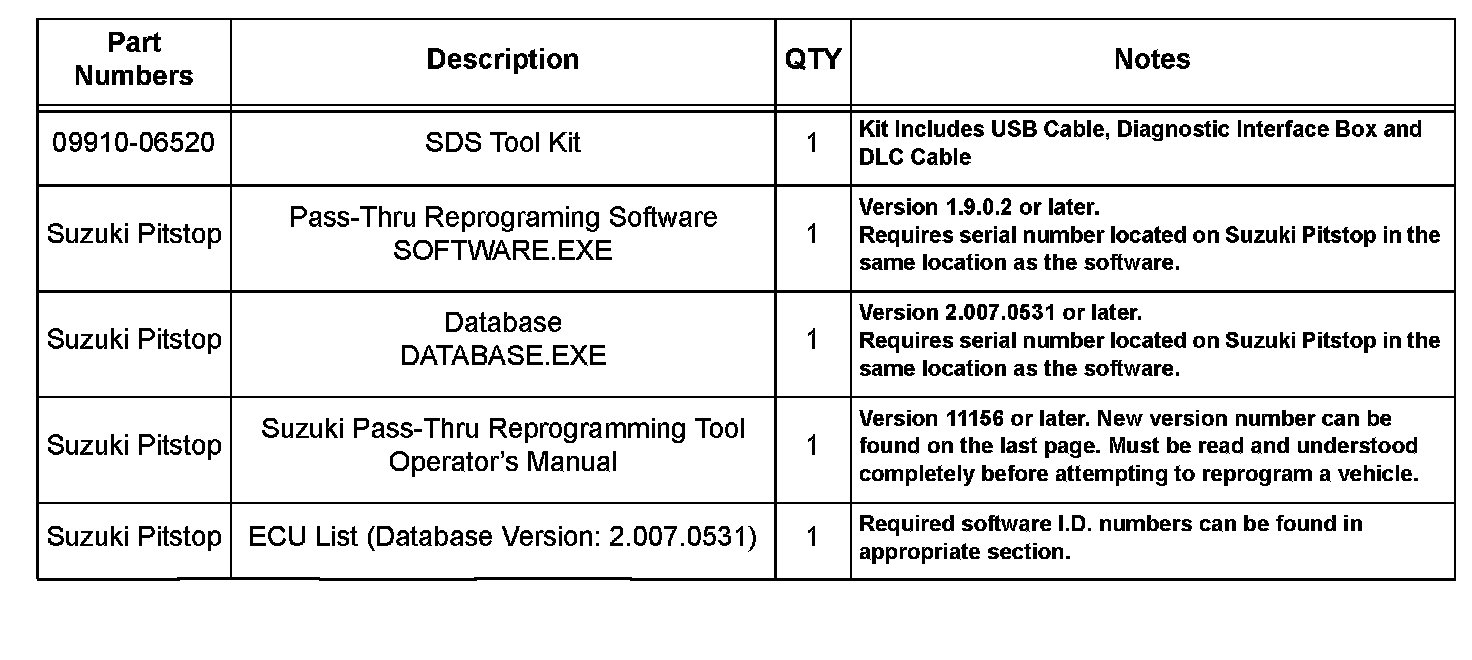 It is required to use the Suzuki Diagnostic System (SDS) Tool to program the blank ECM. See below for requirements and procedure. This procedure is unique and to be used for blank ECM installation. Removal and replacement (R&R) warranty time listed in the warranty flat rate manual already includes programming time.