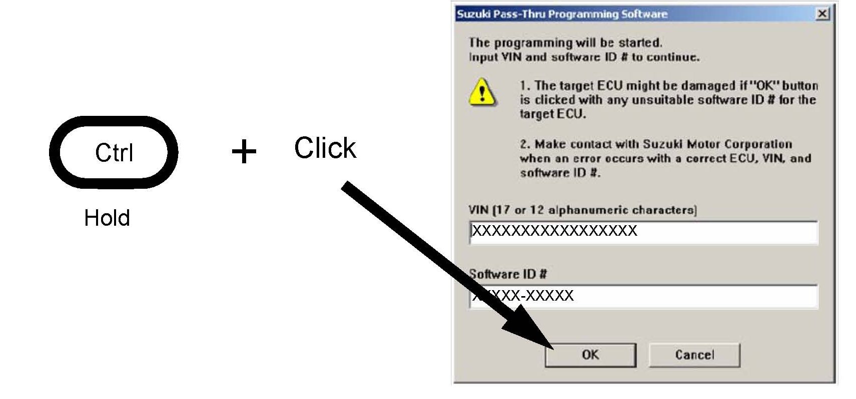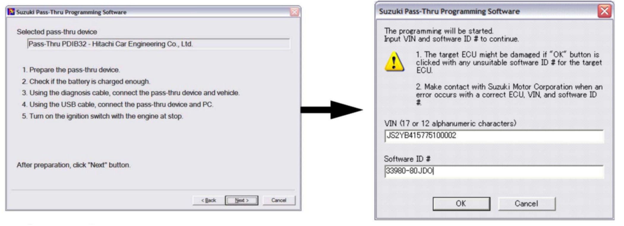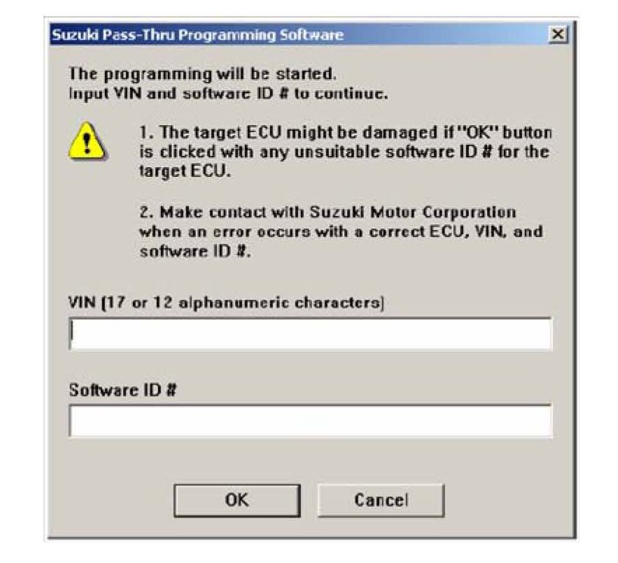 8. Make sure the correct VIN number and software ID number is entered in the VIN entry window. Use the ECU list (found on Suzuki Pitstop) with the version number which matches the database version installed in your PC.
