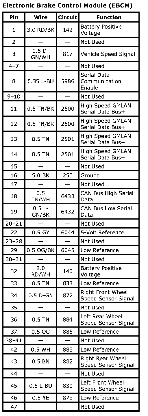 Electronic Brake Control Module (EBCM)Connector Part Information
