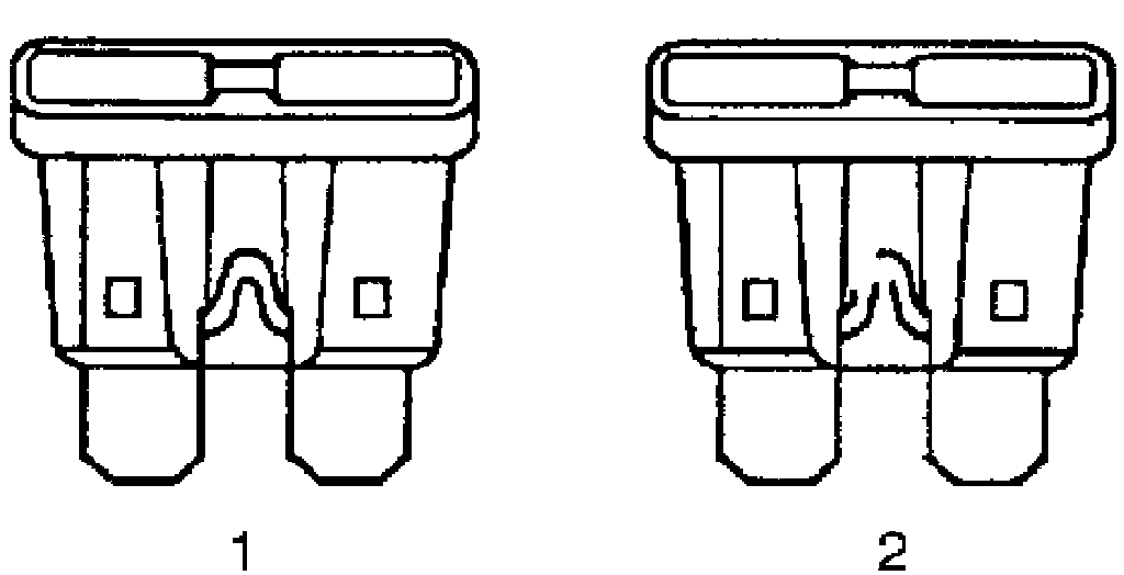 Circuit Protection - FusesThe fuse is the most common method of an automotive wiring circuit protection. Whenever there is an excessive amount of current flowing through a circuit the fusible element will melt and create an open or incomplete circuit. Fuses are an one time protection device and must be replaced each time the circuit is overloaded. To determine if a fuse is open, remove the suspected fuse and examine the element in the fuse for an open (2). If not broken (1), also check for continuity using a DMM or a continuity tester. If the element is open or continuity is suspect, replace the fuse with one of equal current rating.
