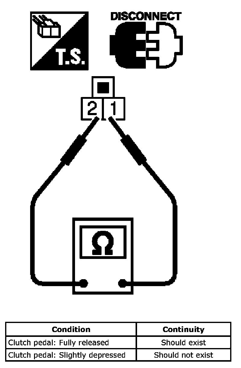 3. Check continuity between ASCD clutch switch terminals 1 and 2 under the following conditions.