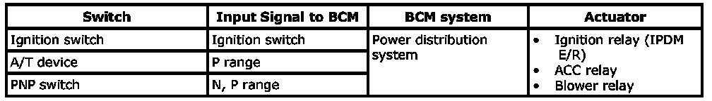 - The ignition switch operation is input to BCM as a signal. BCM changes the power supply position according to the status and operates the ignition relay (inside IPDM E/R) to supply power to each power circuit.