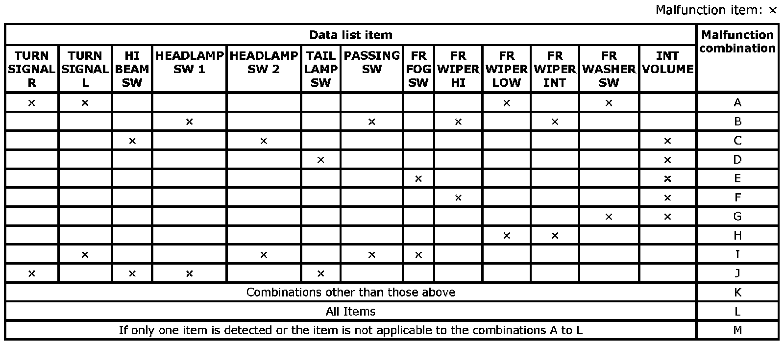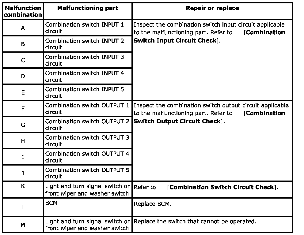 Home >> Suzuki >> 2009 >> Equator 2WD L4-2.5L >> Repair and Diagnosis >> Powertrain Management >> Computers and Control Systems >> Body Control Module >> Testing and Inspection >> Component Tests and General Diagnostics >> Combination Switch System Symptoms: Symptom Table