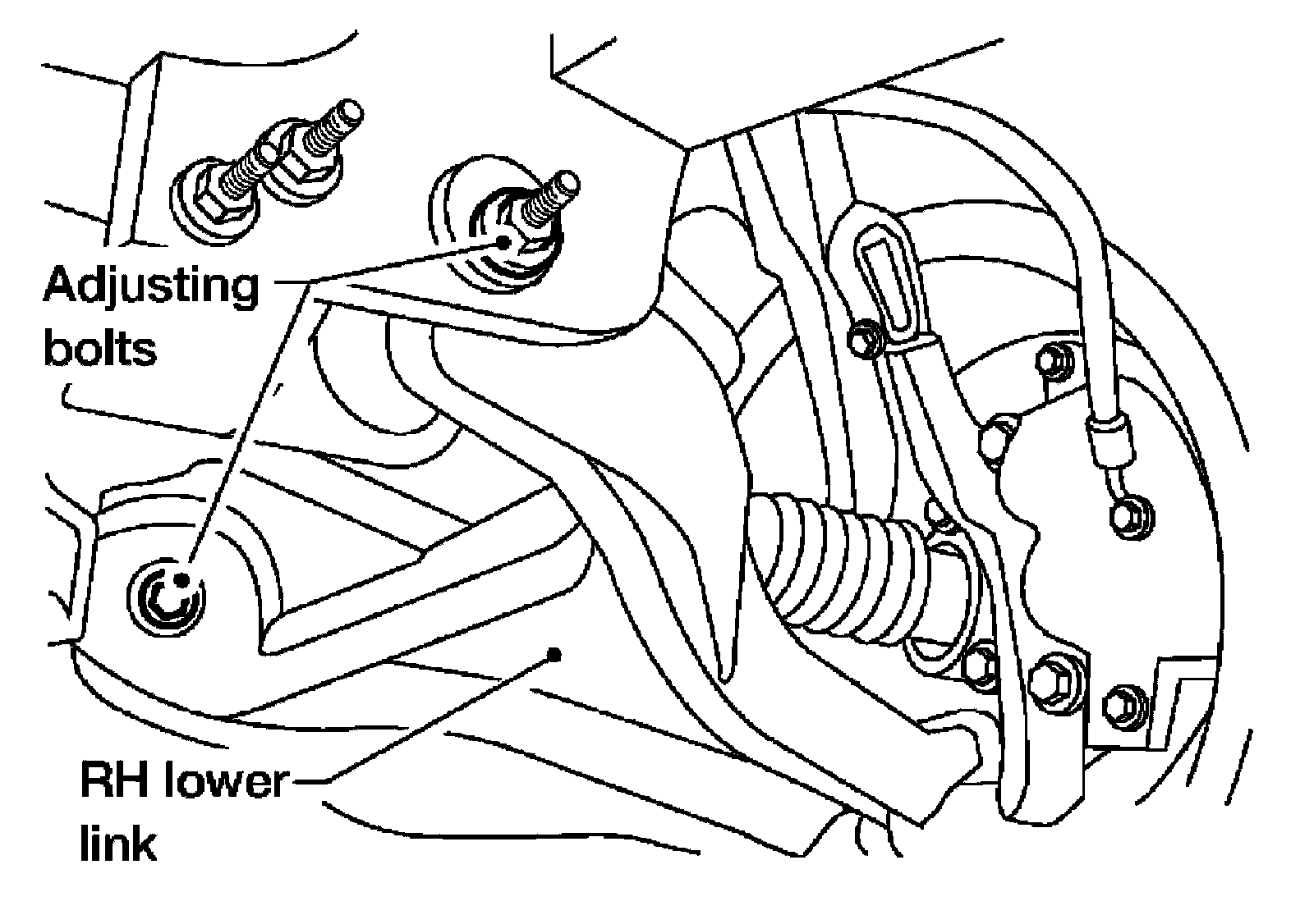 Some vehicles may be equipped with straight (non-adjustable) lower link bolts and washers. In order to adjust camber and caster on these vehicles, first replace the lower link bolts and washers with adjustable (cam) bolts and washers.