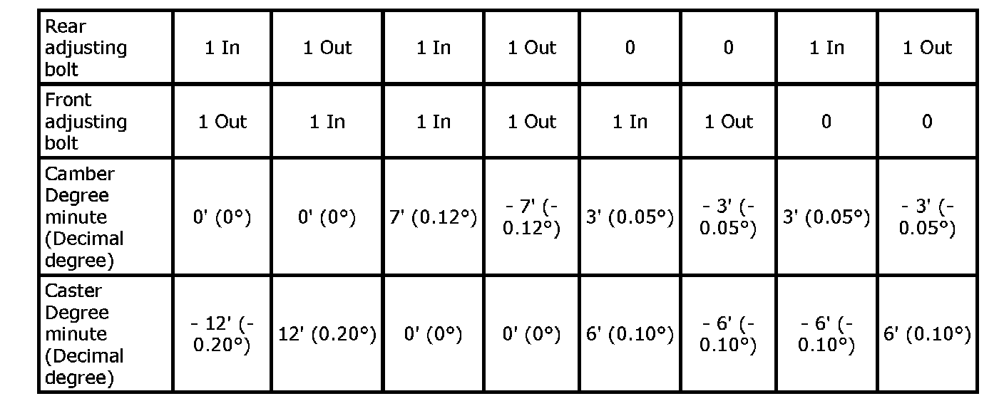 Camber changes about 3' (0.05 degrees) minutes with each graduation of one adjusting bolt. Refer to table below for examples of lower link adjusting bolt effect on camber and caster.