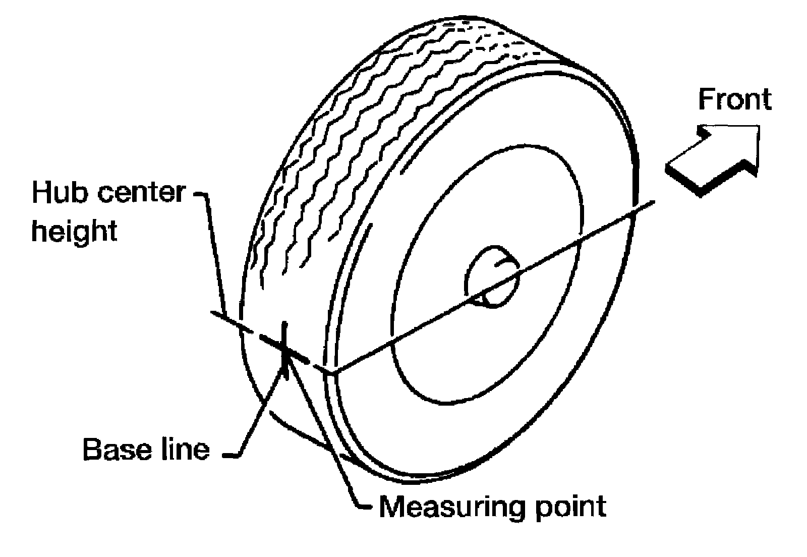 3) Put a mark on base line of the tread (rear side) of both front tires at the same height as hub center as shown. These marks are measuring points.