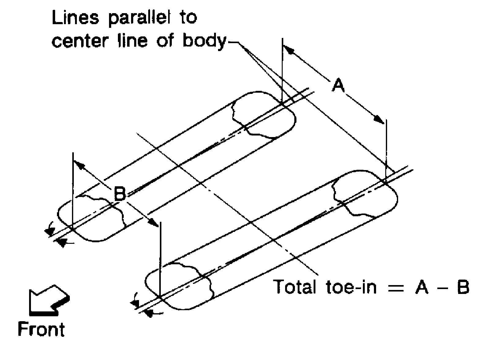 6) Measure the distance "B" on the front side of the front tires at the same marks as shown. Total toe-in is calculated as "A"-"B".