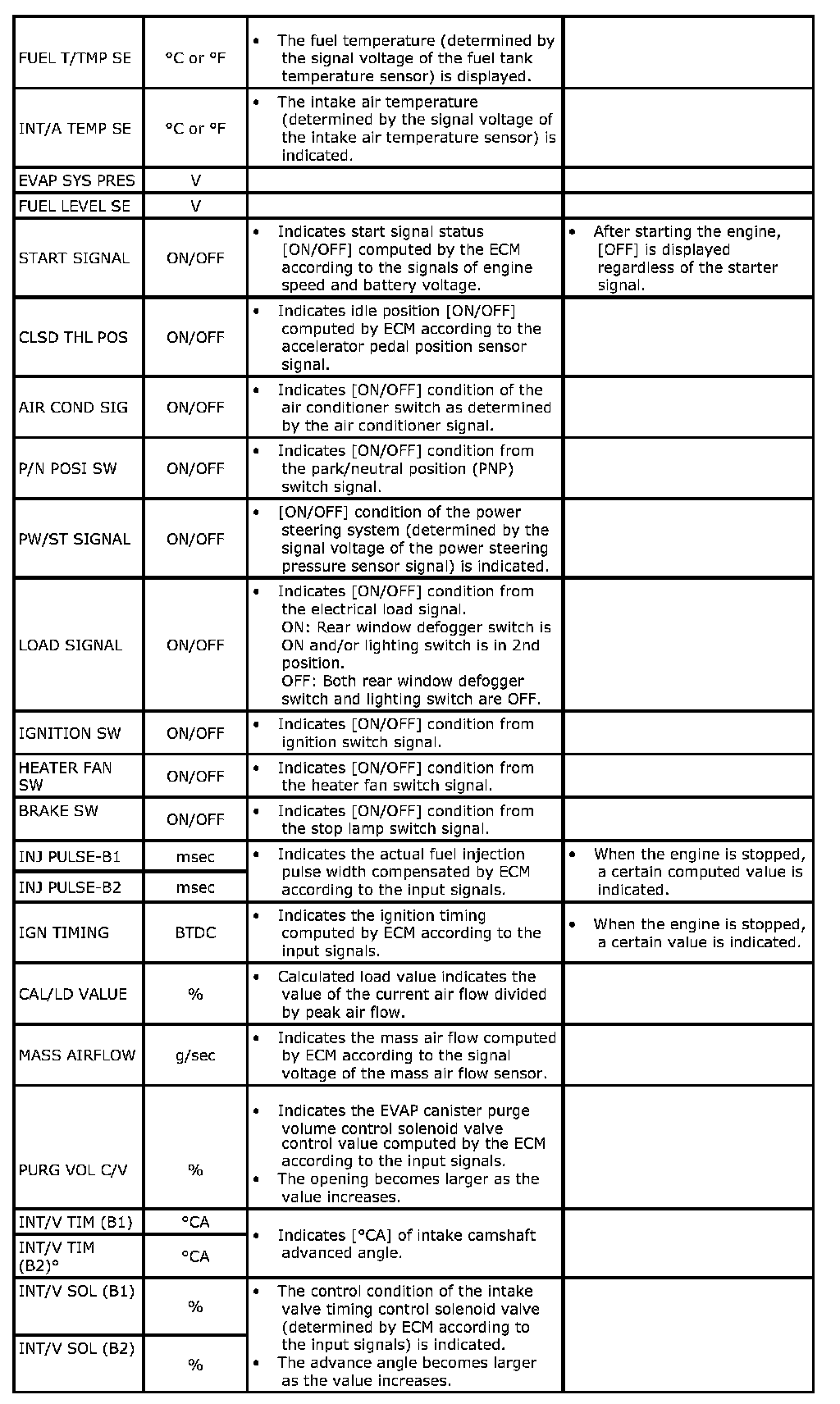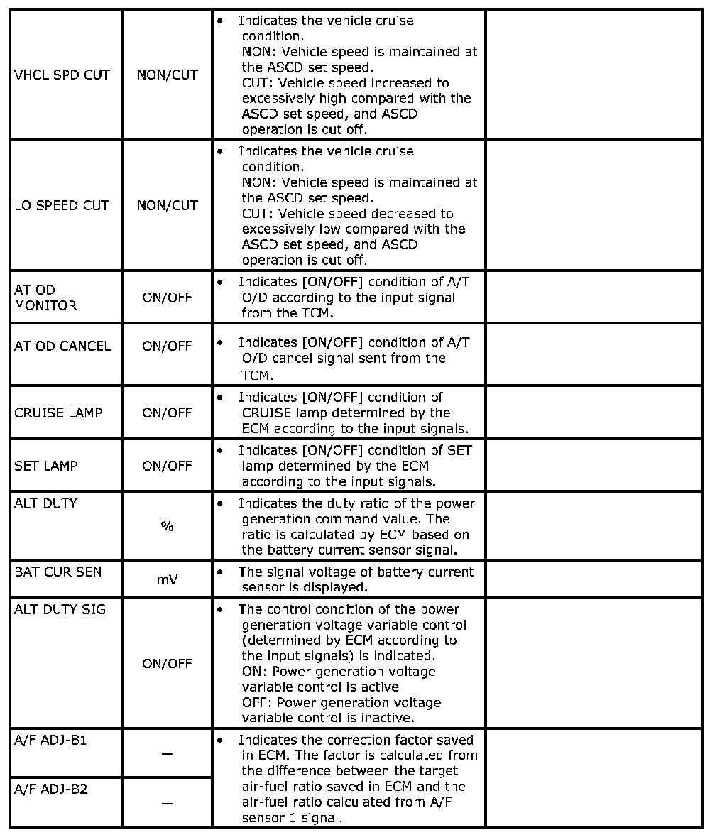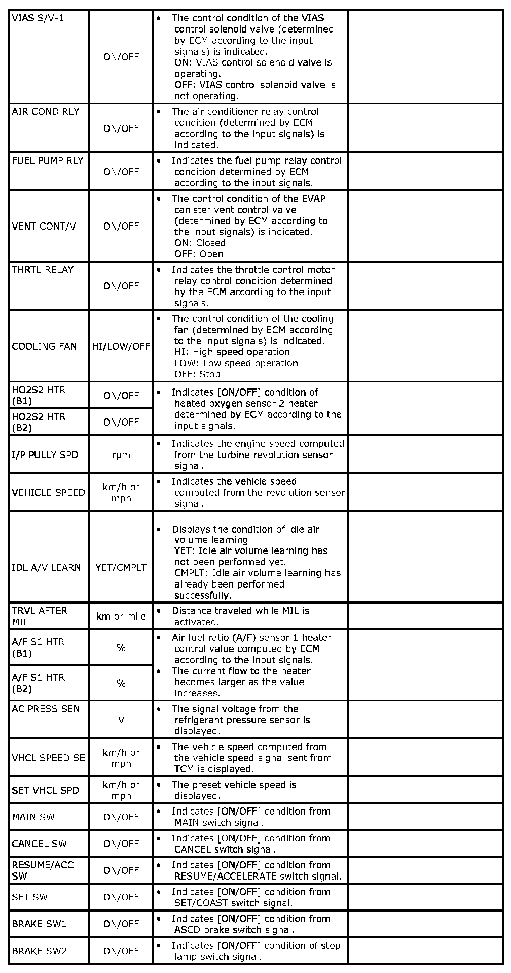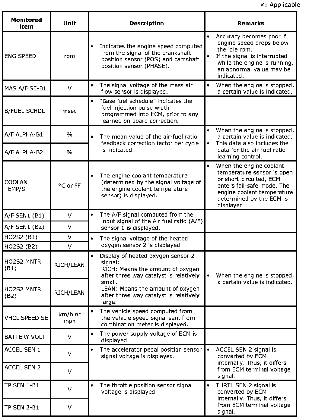 Any monitored item that does not match the vehicle being diagnosed is deleted from the display automatically.