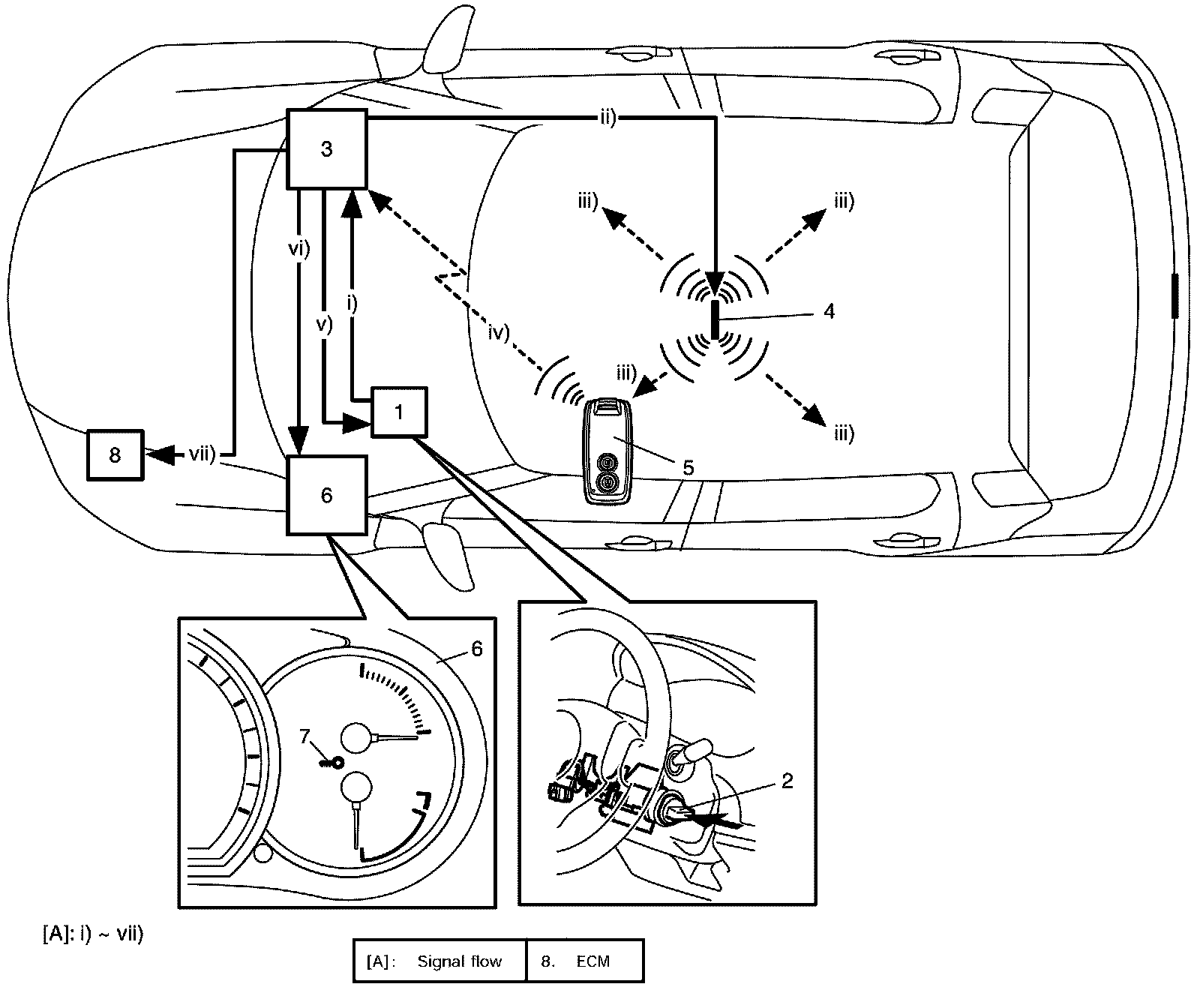 Keyless Engine Start FunctionWhen the ignition knob switch (2) installed to the steering lock unit (1) is pushed, the keyless start control module (3) activates the center antenna (4) to send out the request signal in the vehicle compartment. When the remote controller (5) receives the request signal from the center antenna, it transmits the ID code to the keyless start control module. The keyless start control module compares the ID code sent by the remote controller with the ID code registered in the keyless start control module. When these ID codes match, the keyless start control module makes the key indicator light (7) in the combination meter (6) light in blue and unlocks the steering lock unit to enable the ignition knob switch to turn. When the ignition knob switch is turned to ON position in this state, ID codes of ECM and keyless start control module are compared through CAN communication (immobilizer function). When they match, turning the ignition knob switch to start position will start the engine.