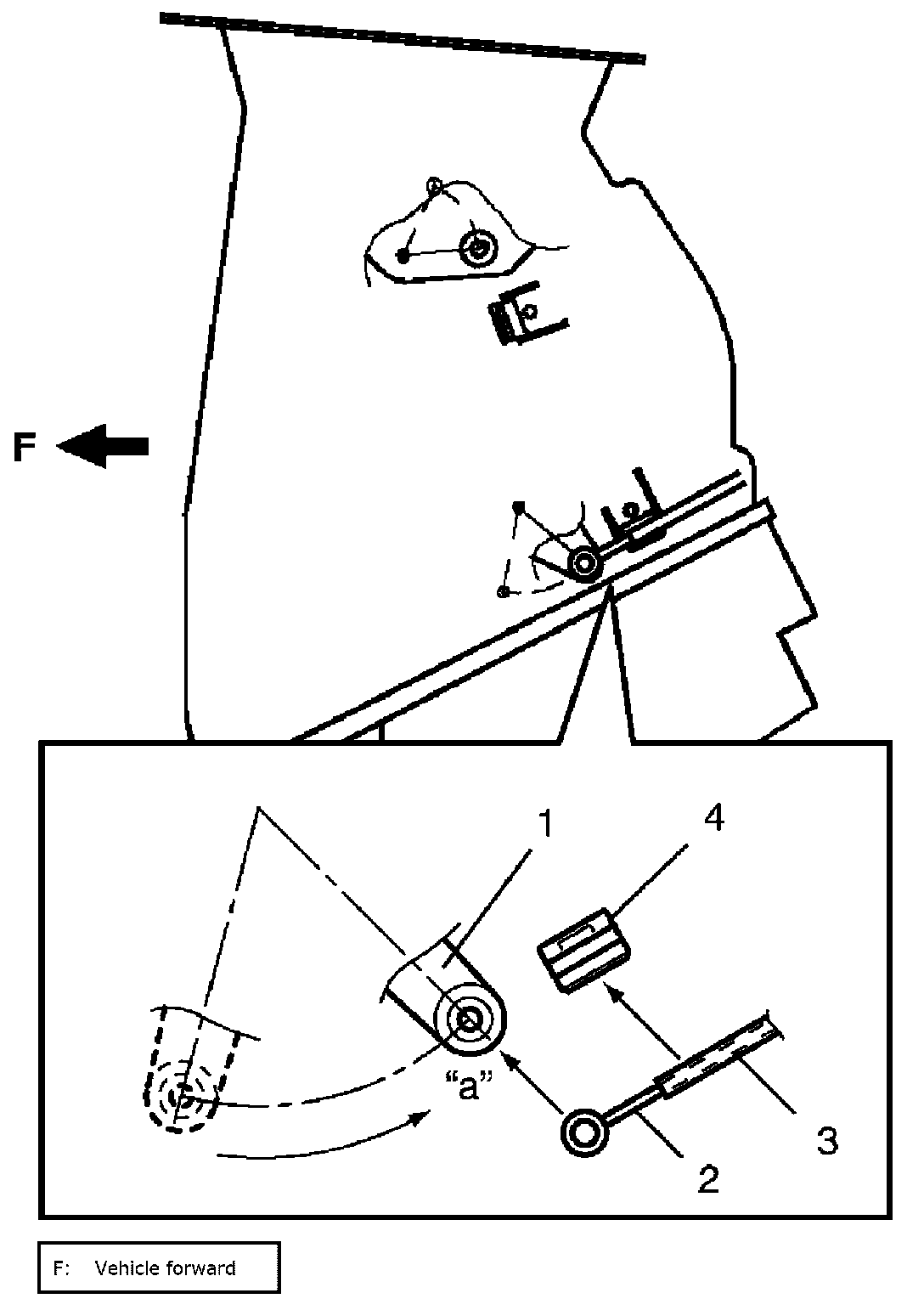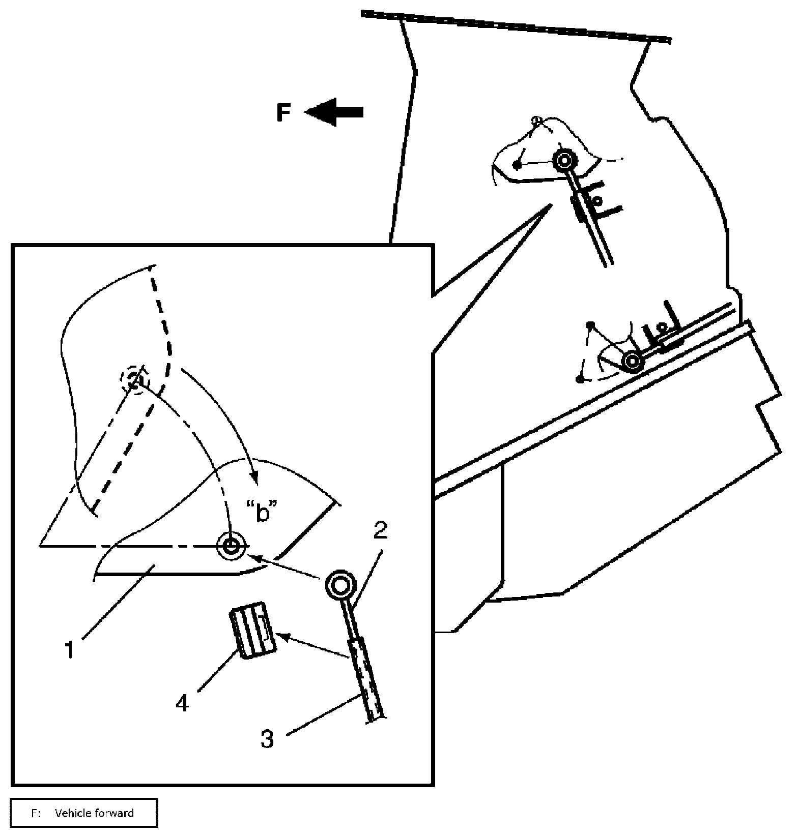 c. Move air flow control plate (1) to "DEF" position "b", then fix air flow control inner cable (2) to pin of air flow control plate and fix outer cable (3) to cable lock clamp (4).
