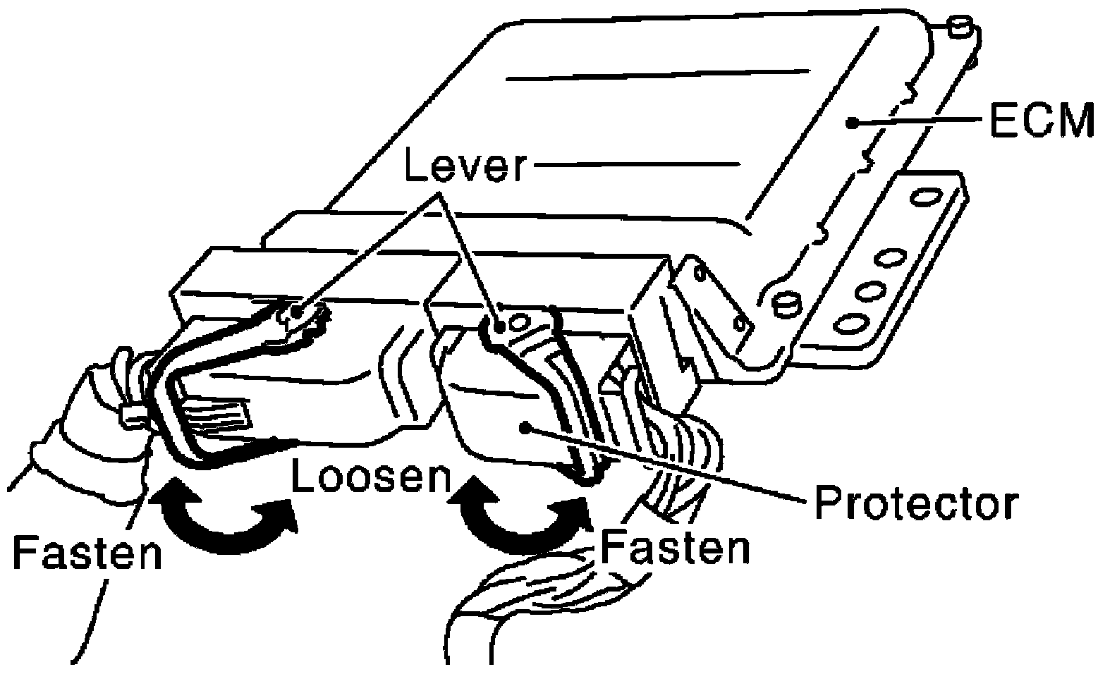 - When connecting ECM harness connector, fasten it securely with a lever as far as it will go as shown in the figure.
