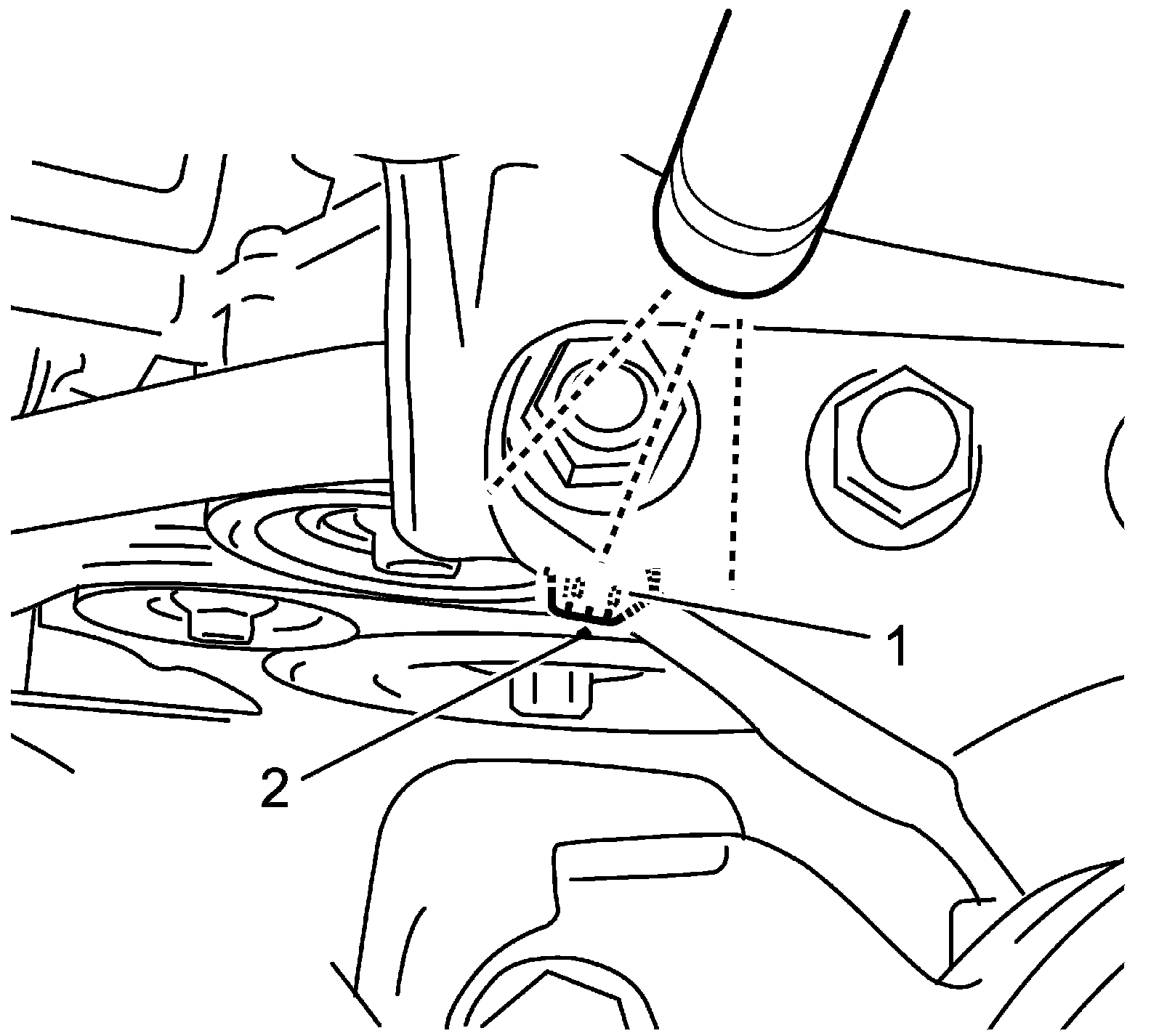 10. Check that the ignition timing is at the specified value using the timing chain cover mark (1) and crankshaft pulley notch mark (2).