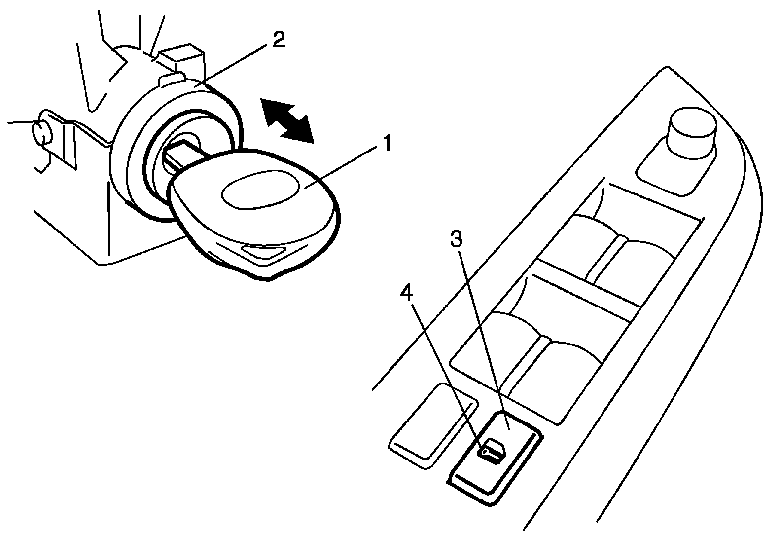 a. Insert ignition key (1) in ignition key cylinder (2).