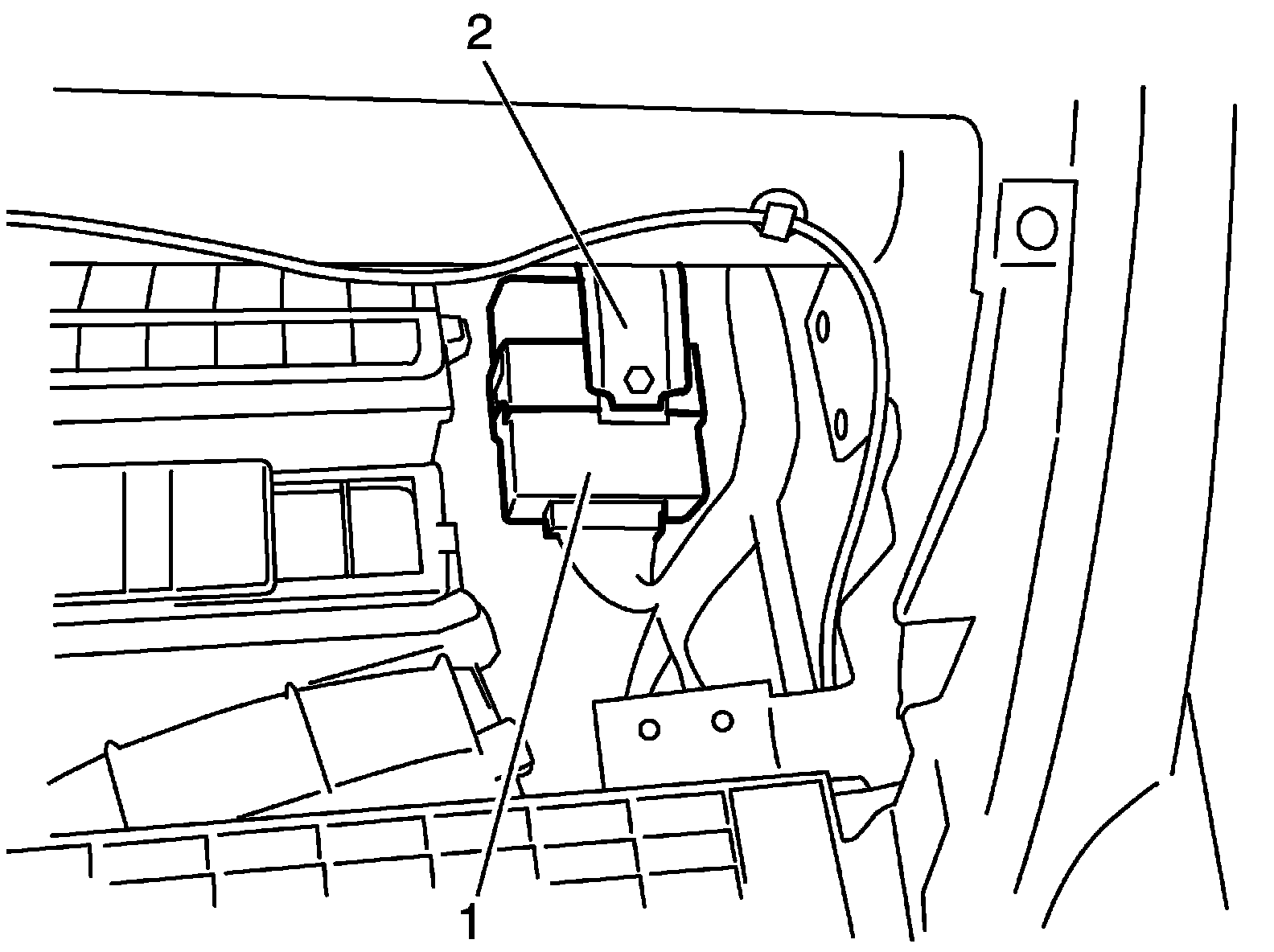 4. Remove keyless start control module mounting bolt and then remove keyless start control module (1) from steering support member (2).