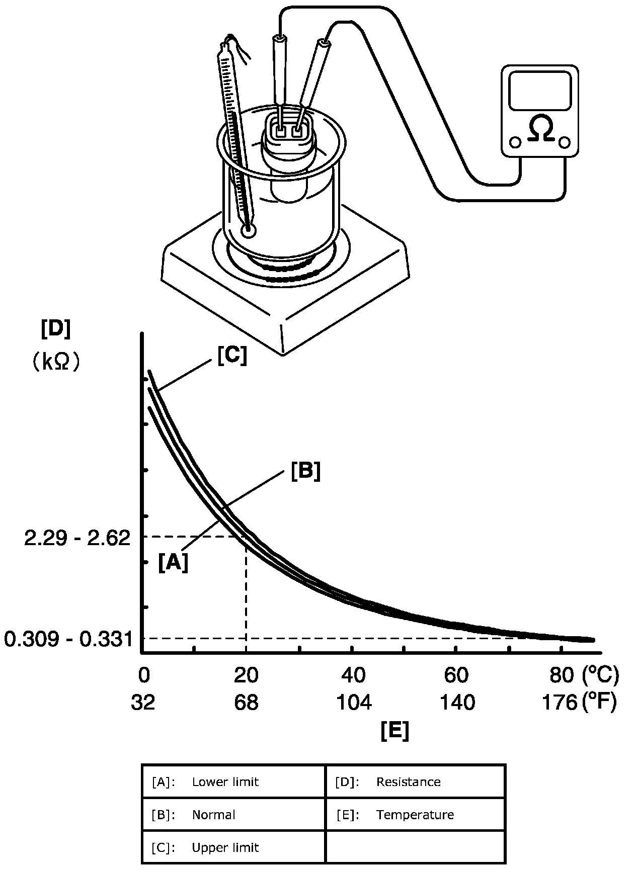 If measured resistance doesn't show such characteristic as shown, replace ECT sensor.