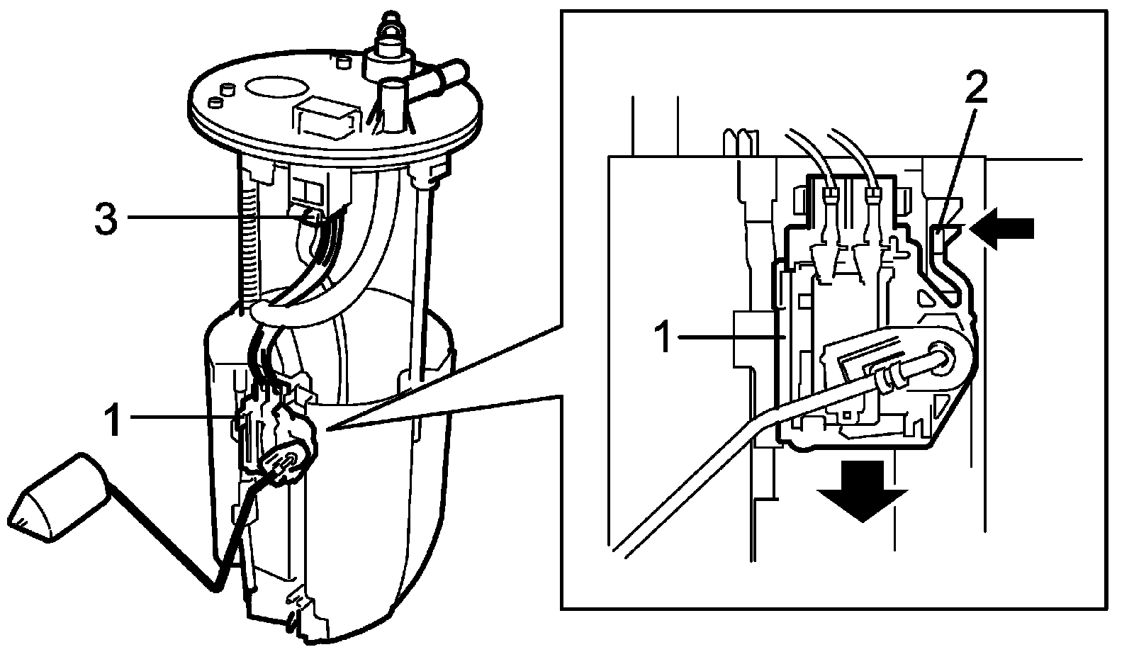 3. With pressing snap-fit part (2), remove fuel level sensor (1) by sliding it in the arrow direction as shown in figure.