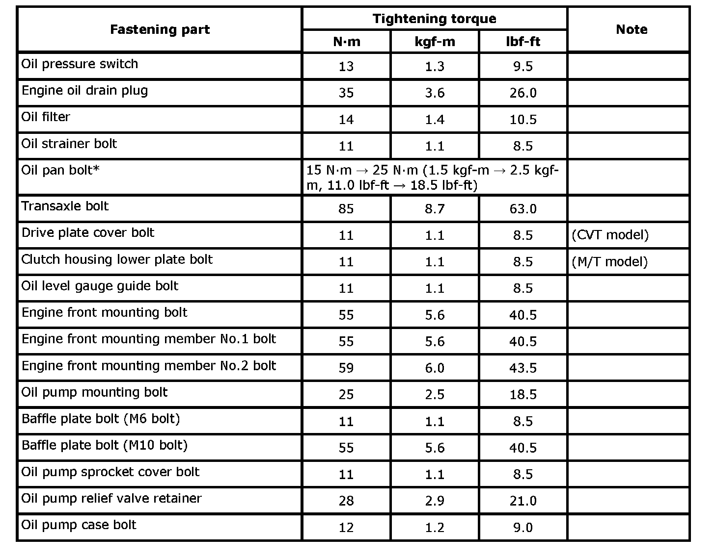 For the tightening torque of fastener not specified in this section, refer to Fasteners Information.