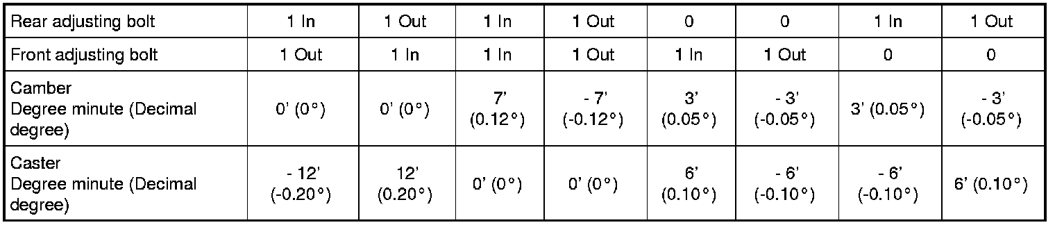 Camber changes about 3' (0.05°) minutes with each graduation of one adjusting bolt. Refer to table below for examples of lower link adjusting bolt effect on camber and caster.