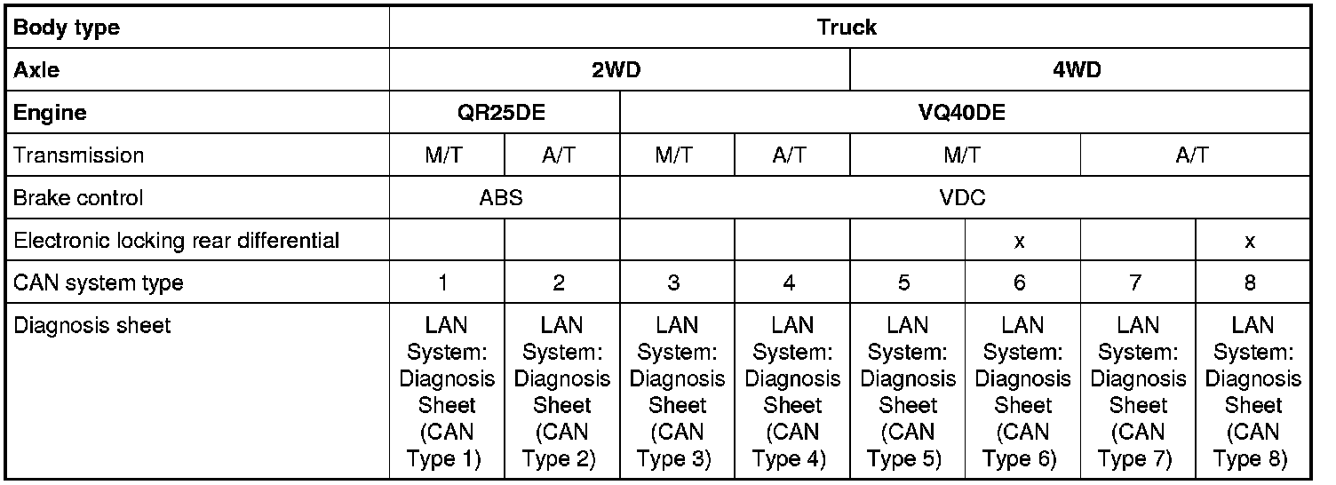 Determine CAN system type from the following specification chart. Then choose the correct diagnosis sheet.