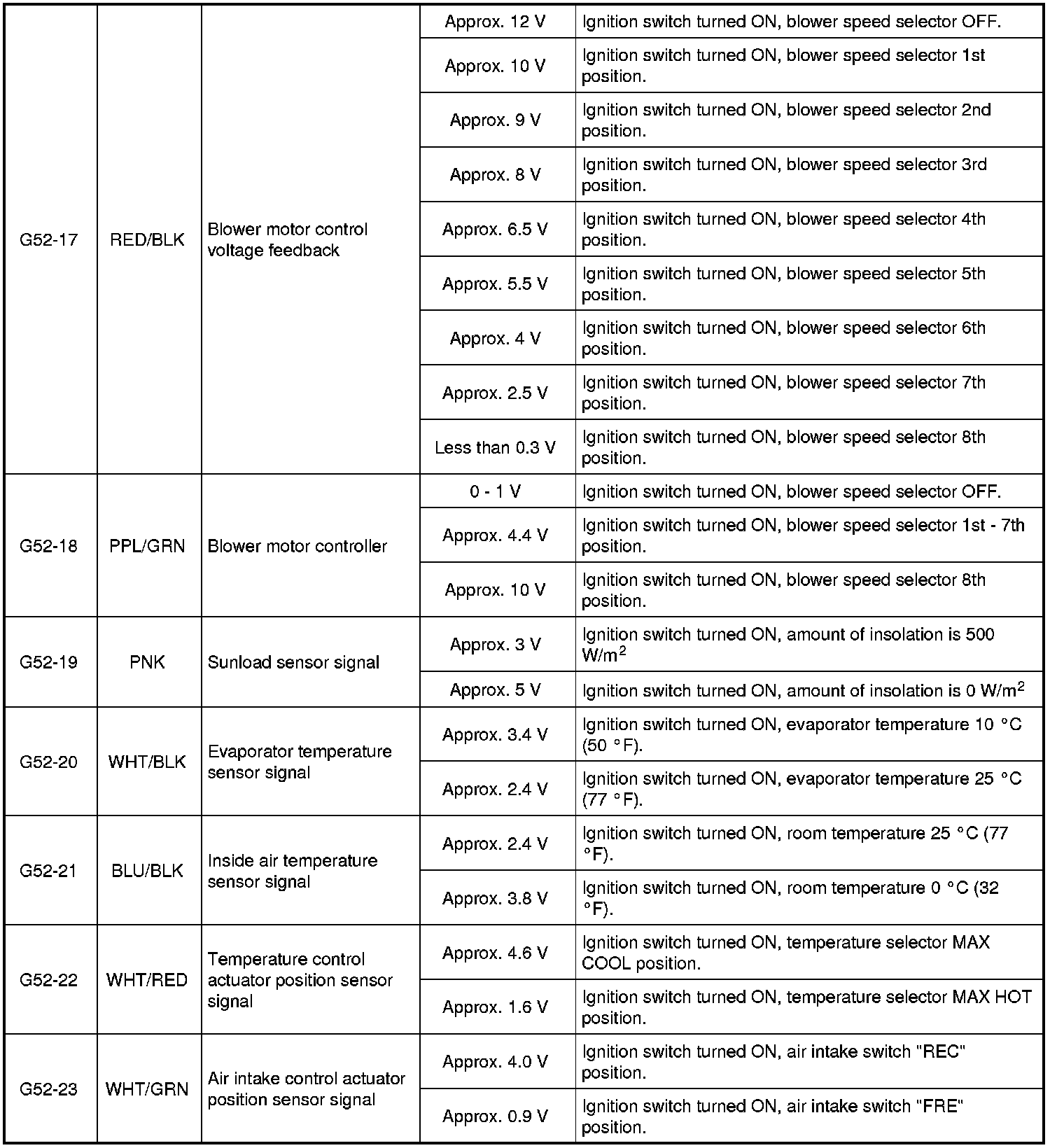 3) Check voltage and/or pulse signal at each terminal of connector connected by referring to HVAC Control Module Voltage Table.