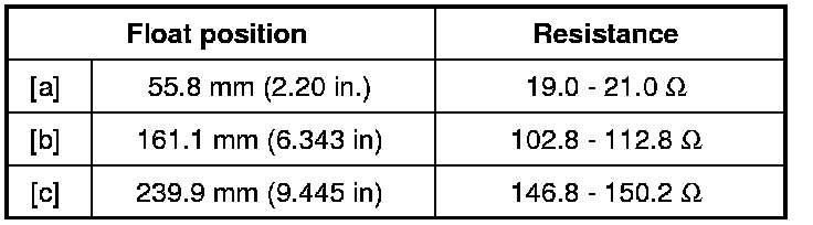 Check resistance between terminals (1) and (2) at each float position [a], [b] and [c].