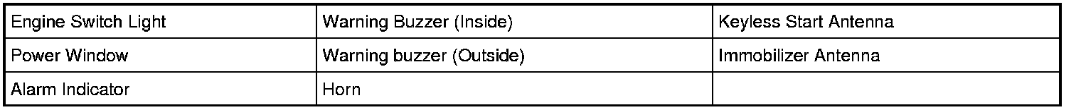 SUZUKI scan tool has output test function which can force operation of the following actuators and relays of the system controlled by keyless start control module. When a malfunction is found in the system controlled by keyless start control module, execute output test which enables easy judgment whether malfunction is on input side or output side of keyless start control module. For detailed information on operation of SUZUKI scan tool, refer to "SUZUKI Scan Tool Operator's Manual".