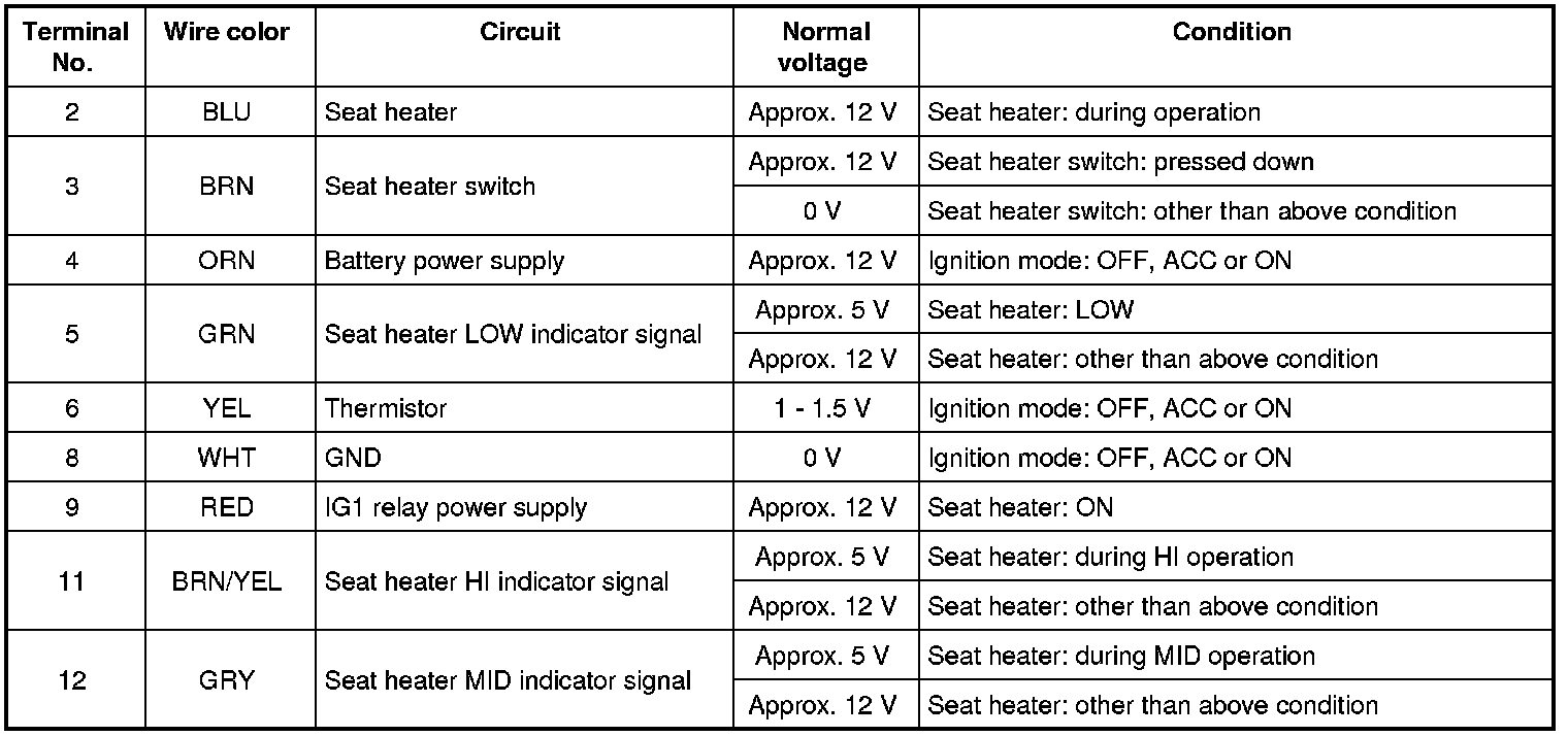 Never connect a voltmeter directly to any terminal on the seat heater control module by disconnecting the its connectors.