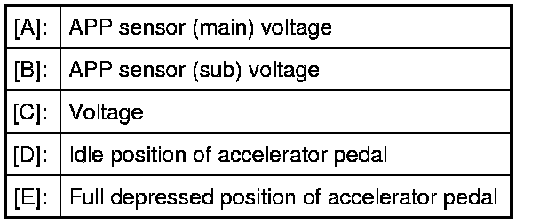 If sensor voltage is out of specified value or does not vary linearly as the following graph, check APP sensor assembly referring to Accelerator Pedal Position (APP) Sensor Assembly Inspection Accelerator Pedal Position (APP) Sensor Assembly Inspection.