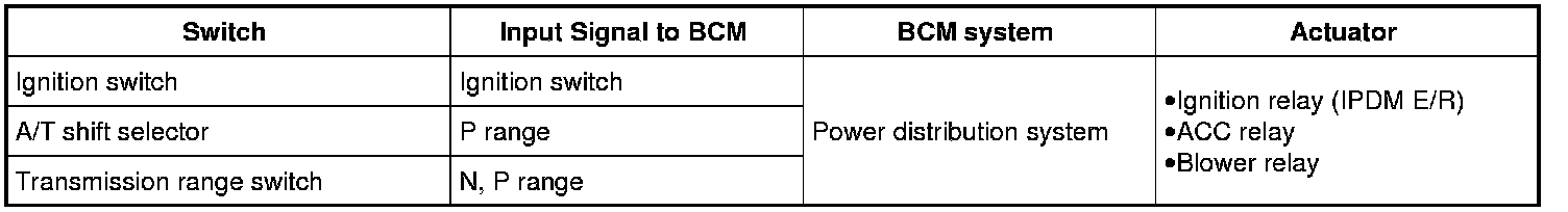 - The ignition switch operation is input to BCM as a signal. BCM changes the power supply position according to the status and operates the ignition relay (inside IPDM E/R) to supply power to each power circuit.
