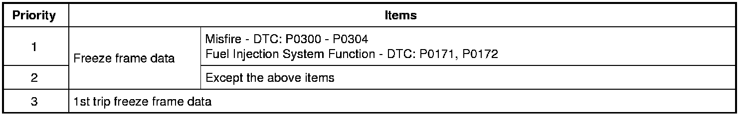 For example, the EGR malfunction (Priority: 2) was detected and the freeze frame data was saved in the 2nd trip. After that when the misfire (Priority: 1) is detected in another trip, the freeze frame data will be updated from the EGR malfunction to the misfire. The 1st trip freeze frame data is updated each time a different malfunction is detected. There is no priority for 1st trip freeze frame data. However, once freeze frame data is stored in the ECM memory, 1st trip freeze data is no longer stored (because only one freeze frame data or 1st trip freeze frame data can be stored in the ECM). If freeze frame data is stored in the ECM memory and freeze frame data with the same priority occurs later, the first (original) freeze frame data remains unchanged in the ECM memory.