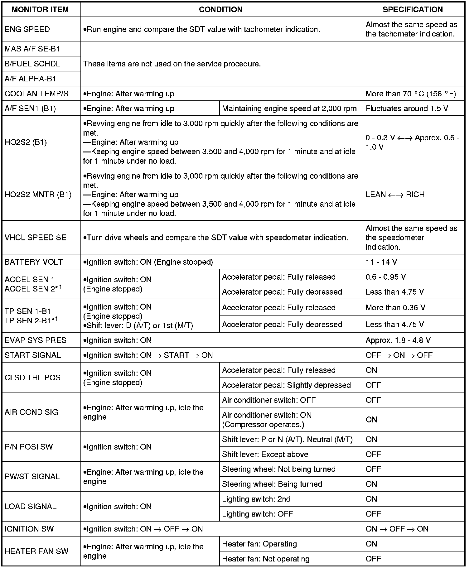 *1: Accelerator pedal position sensor 2 signal and throttle position sensor 2 signal are converted by ECM internally. Thus, they differ from ECM terminals voltage signal.