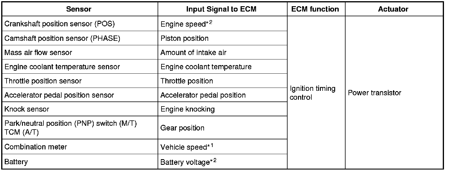 The ECM receives information such as the injection pulse width and camshaft position sensor (PHASE) signal. Computing this information, ignition signals are transmitted to the power transistor.