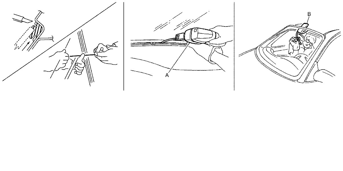 4) Remove windshield glass using piano wire or power cutting tool (A) and an inflatable pump bag (B).