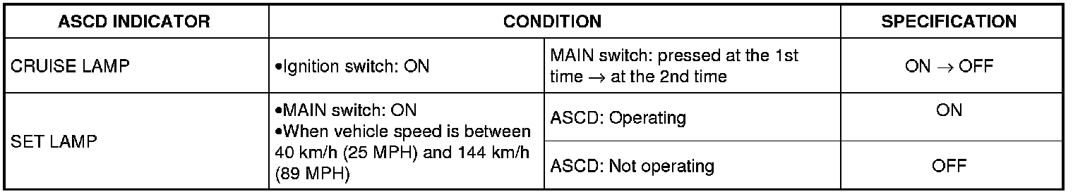 CRUISE indicator illuminates when MAIN switch on ASCD steering switch is turned ON to indicated that ASCD system is ready for operation.