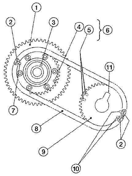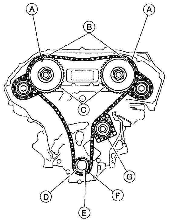 - Install primary timing chain so the mating mark punched (B) on camshaft sprocket is aligned with the blue link (A) on the timing chain, while the mating mark notched (E) on the crankshaft sprocket (D) is aligned with the copper link (F) on the timing chain, as shown.