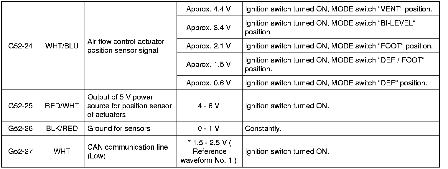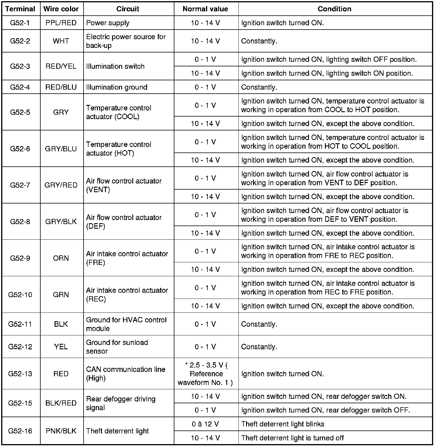 3) Check voltage and/or pulse signal at each terminal of connector connected by referring to HVAC Control Module Voltage Table.