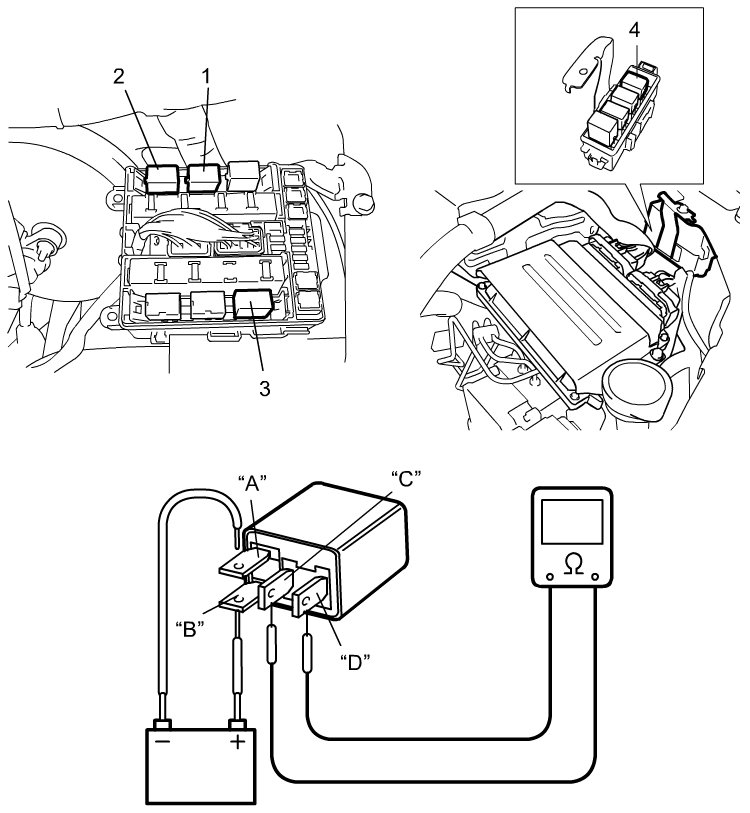 3) Check that there is no continuity between terminals "C" and "D". If there is continuity, replace relay.