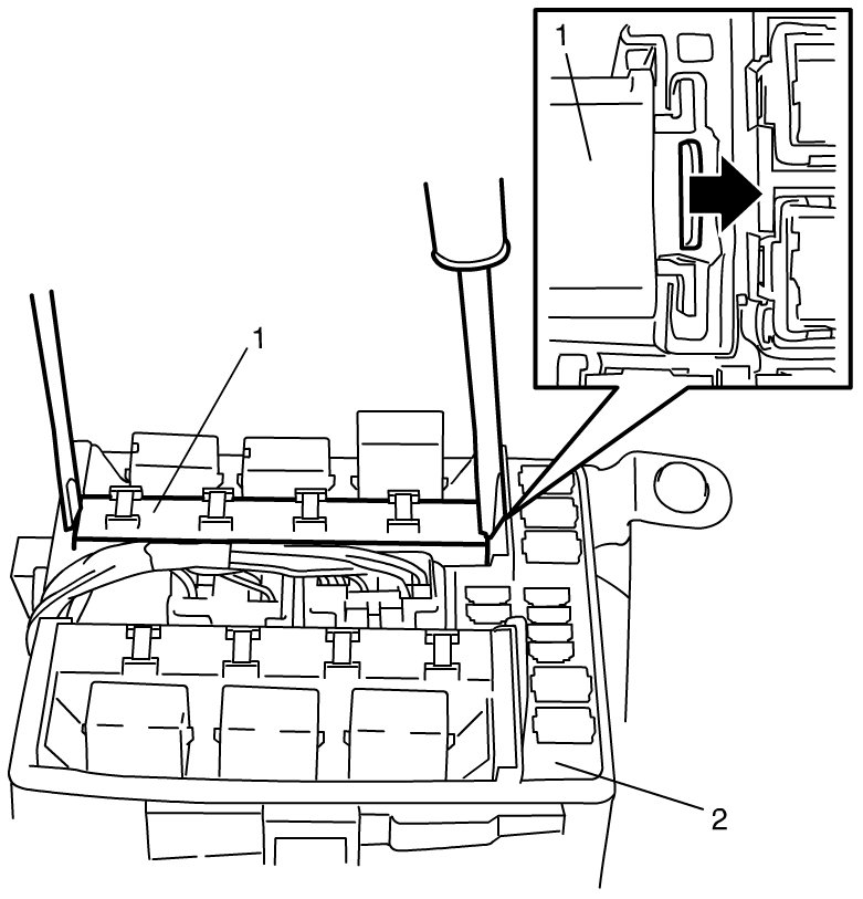 2) Remove integration relay No.2 (1) from fuse box No.2 (2).