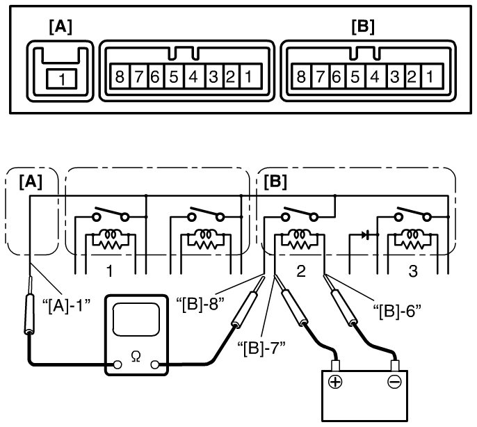 3) Check that there is no continuity between terminals "[A]-1" and "[B]-8" of relay.