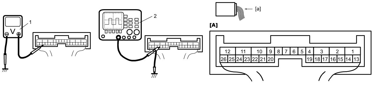 2) Check voltage and/or pulse signal at each terminal of connectors using voltmeter (1) and oscilloscope (2).