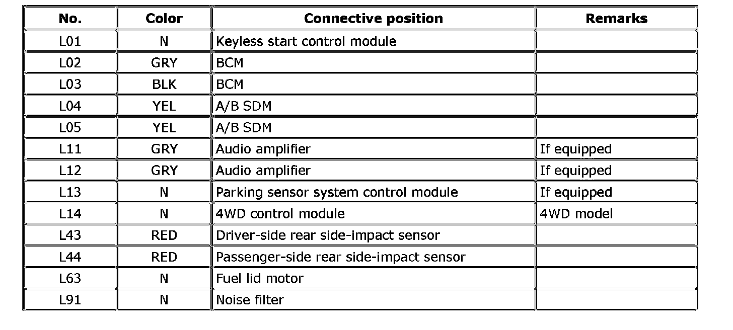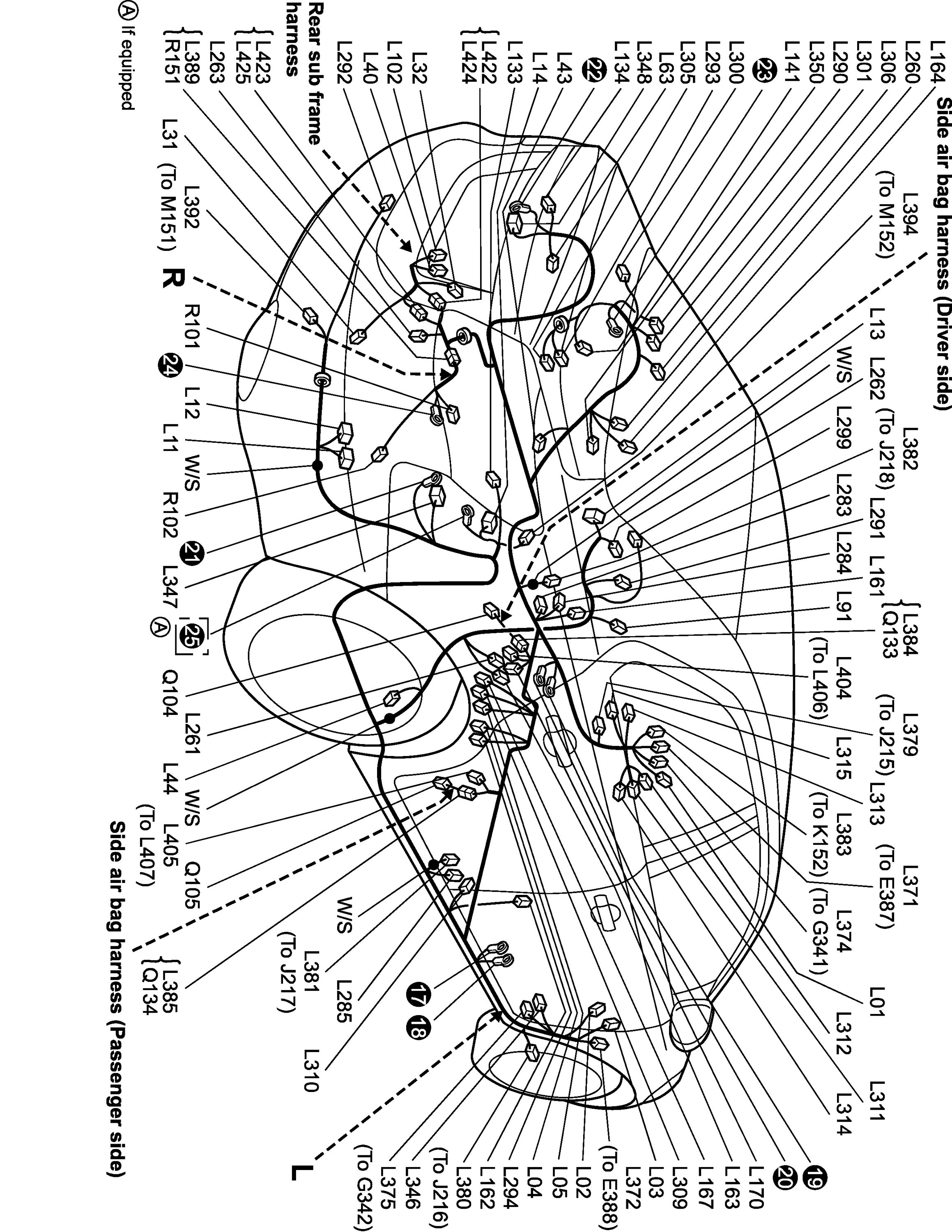 L: Floor Harness, Rear Sub Frame Harness / Q: Side Air Bag Harness / R: Fuel Pump Wire