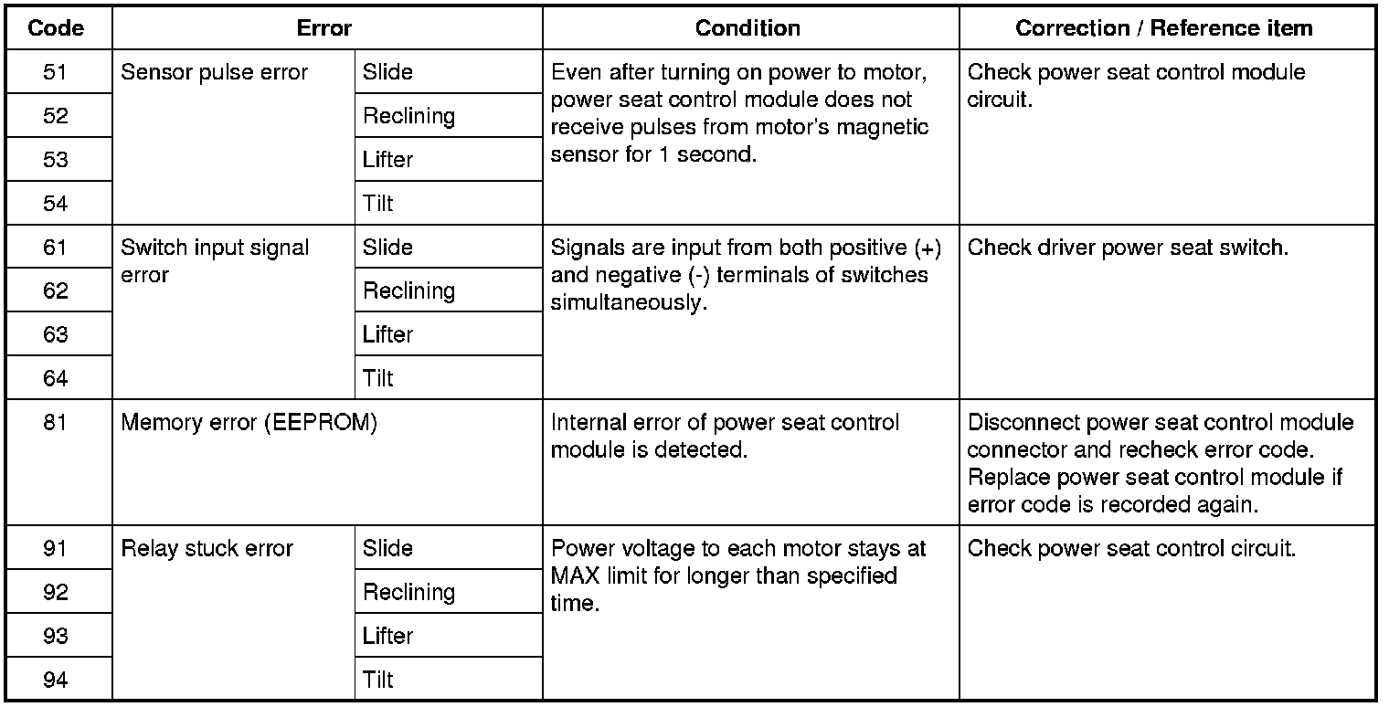 Power seat control module monitors all input and output signals from/to the power seat control system devices. If control module detects any faults in these signals, it records the contents of these faults in memory as error codes. Recorded error codes can be retrieved in the form of buzzer beeps if control module is set to the diagnosis mode. Diagnosis mode also allows monitoring incoming signals to the control module.