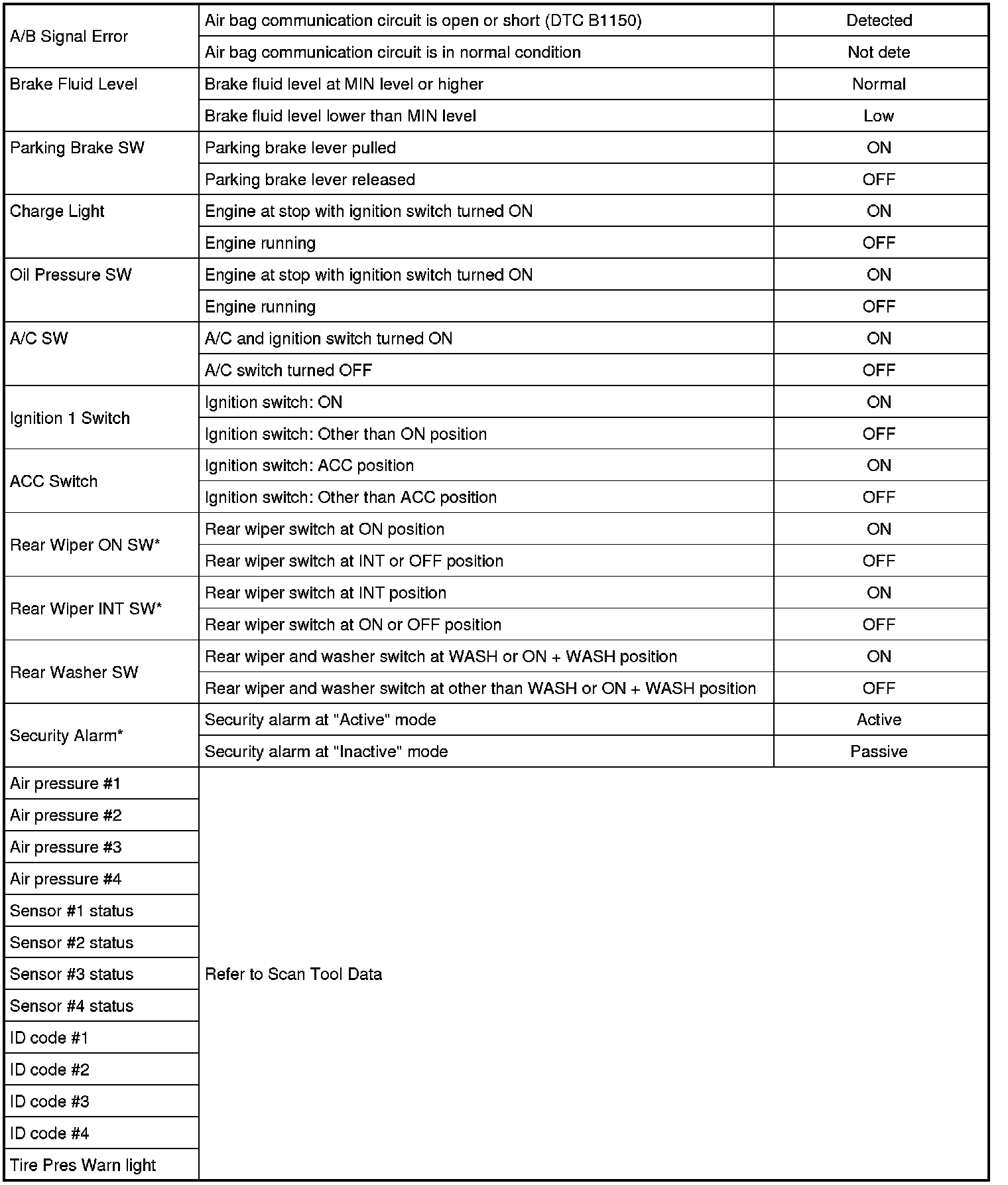 - Not data: Air bag communication circuit in normal condition.