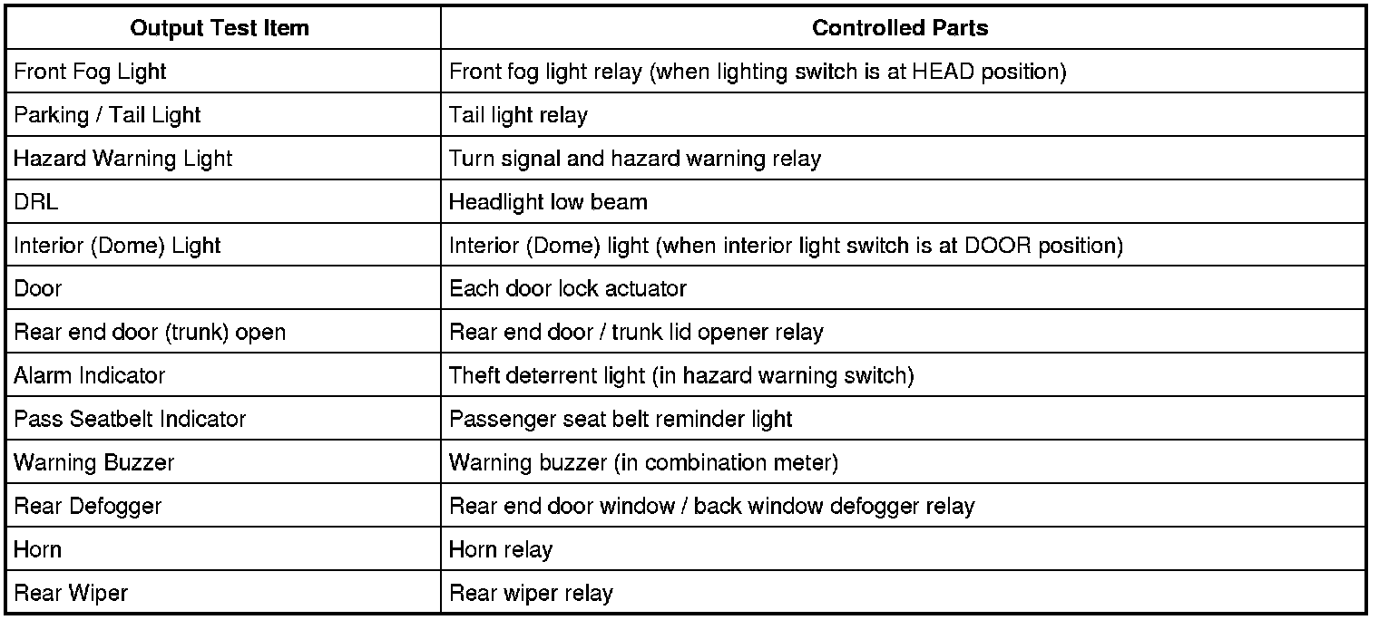 SUZUKI scan tool has the output test function which can force operation of following actuators and relays of the system controlled by BCM. When a malfunction is found in the system controlled by BCM, execute the output test which enables easy judgment whether the malfunction is on the input side or output side of BCM. For detailed information on operation of SUZUKI scan tool, refer to "SUZUKI Scan Tool Operator's Manual".